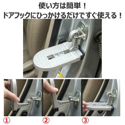 商品名 車用 ドアステップ 商品仕様 重量:約350g 荷重:200kg以下 カラー:ブラック/シルバー 材料:アルミニウム合金 サイズ:14.7cm×7.4cm×8.7cm セット内容 ドアステップ×1 クッションスポンジカバー×1 対応車種 汎用 車のドアにラッチフックがあれば使用可。